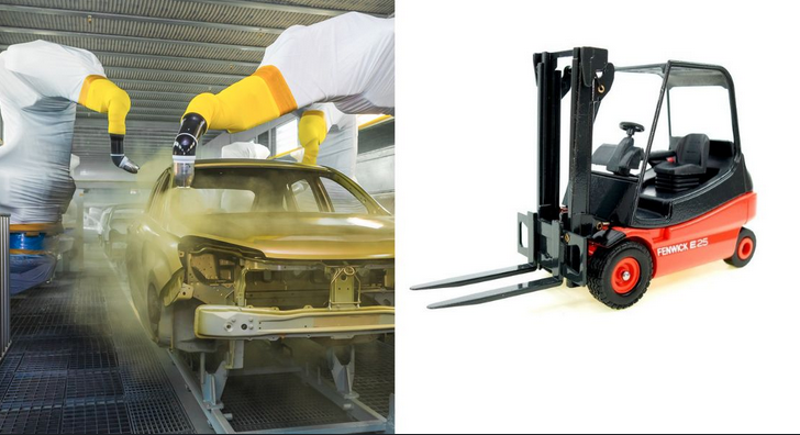Est-ce qu’on pourrait jouer aux 7 différences entre ces 2 images ? Est-ce qu’un robot de peinture industriel et un Fenwick ont des éléments en commun ?