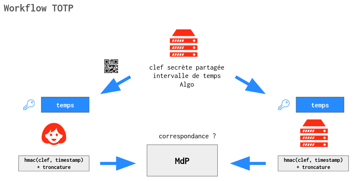 - par l’utilisation du temps et une clef secrète partagée entre le client et le serveur (c’est le T-OTP que nous allons creuser par la suite)